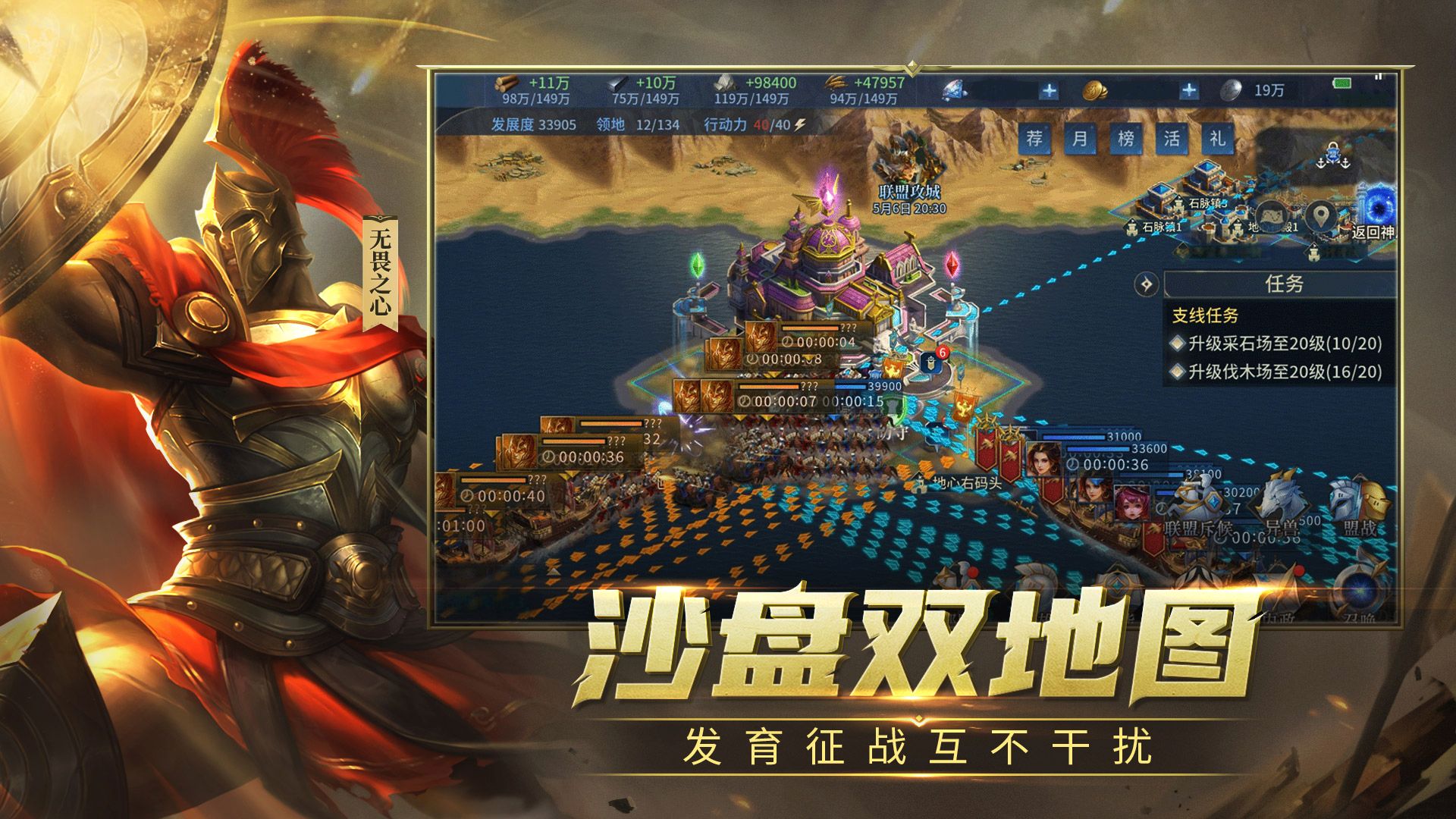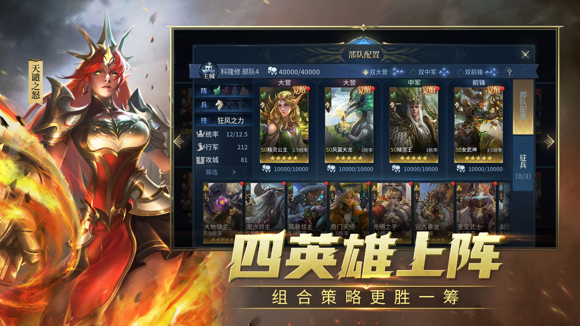 组合策略更胜一筹四位英雄齐上阵,领主可以激活多种英雄组合效果,配合千变万化的战斗技能,使得组合策略更加丰富。同时,可以选择双大营、双中军或双前锋的部队配置,使得每场战斗更具策略深度,让每一次战斗都充满变数和挑战!